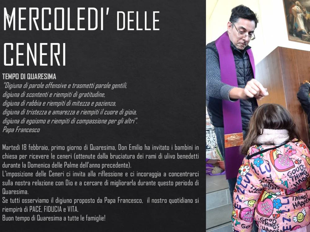 Martedì 18 febbraio, primo giorno di Quaresima, Don Emilio ha invitato i bambini in chiesa per ricevere le ceneri (ottenute dalla bruciatura dei rami di ulivo benedetti durante la Domenica delle Palme dell’anno precedente).