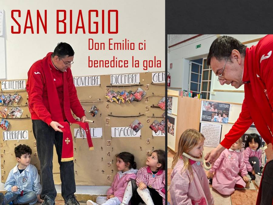 Don Emilio è venuto a scuola, ha raccontato in modo semplice la storia di San Biagio e con le tradizionali candele ha benedetto la gola di bambini e maestre.