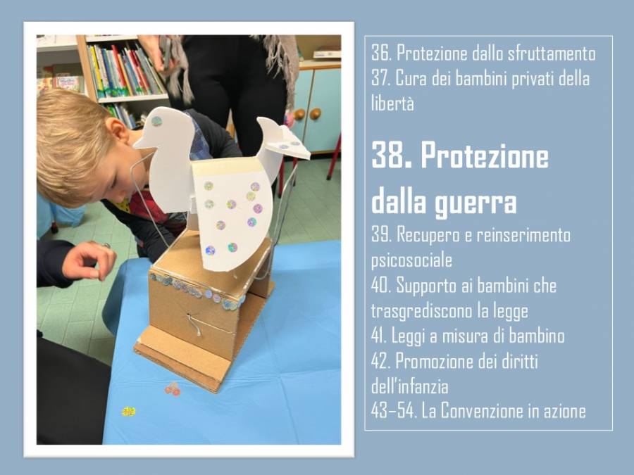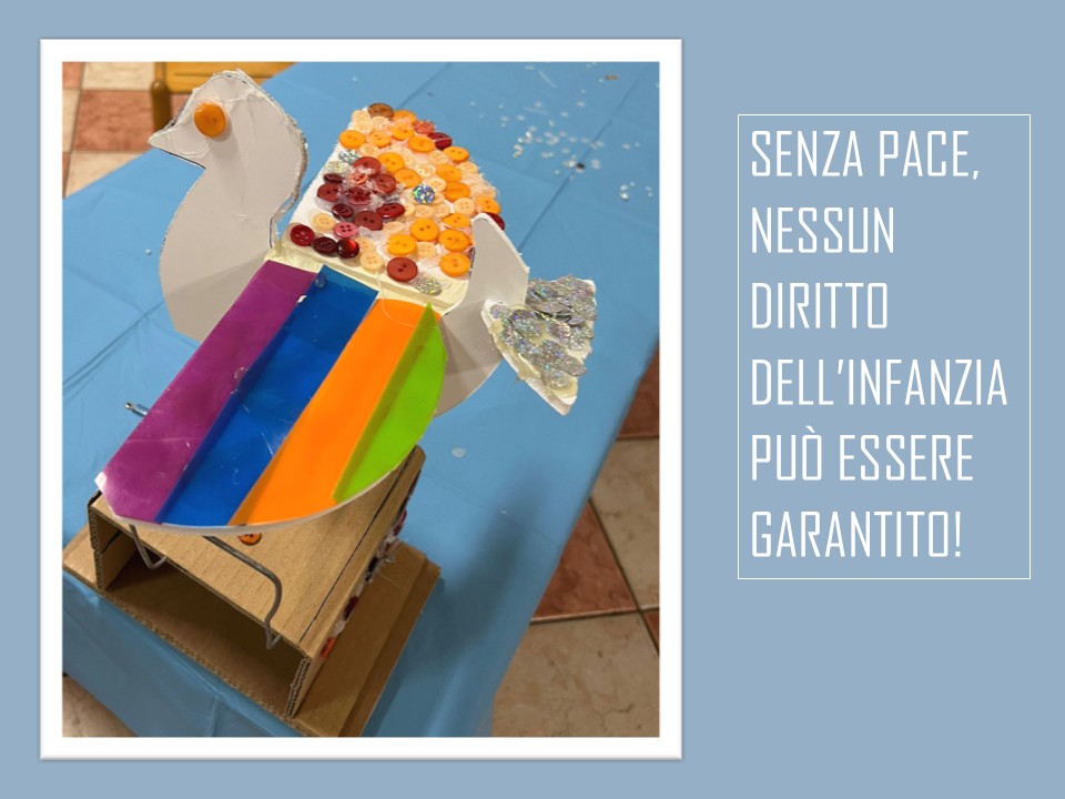 Il laboratorio è stato condotto da Sauro Sabattini -che ringraziamo di cuore per la sensibilità e la cura con cui ha predisposto e guidato l’attività- e ha avuto come esito la costruzione di una colomba mobile.
