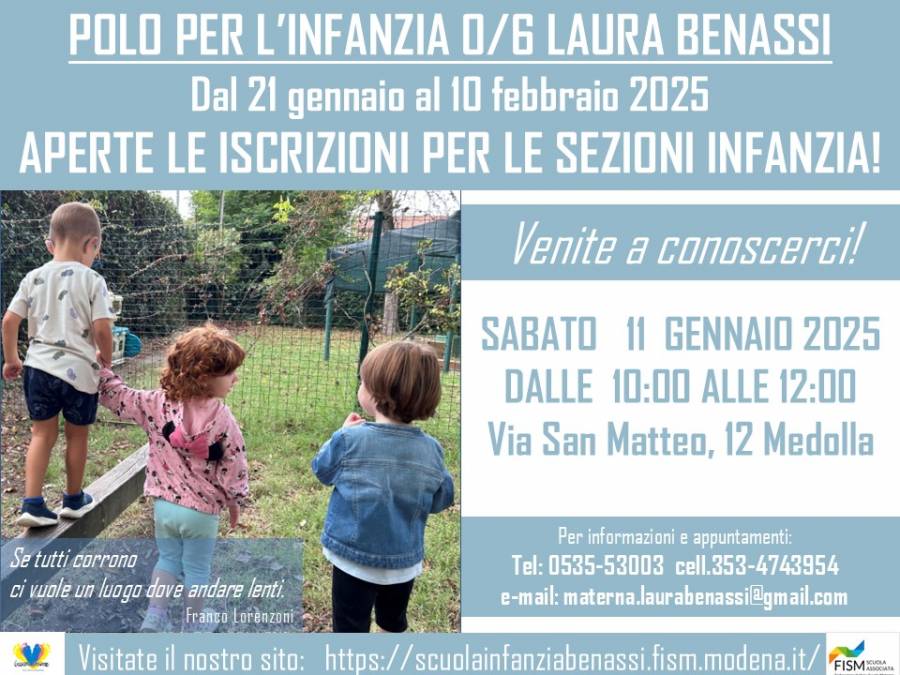 In caso di impossibilità a partecipare all'open day o per avere maggiori informazioni, è possibile fissare un appuntamento scrivendo a: materna.laurabenassi@gmail.com