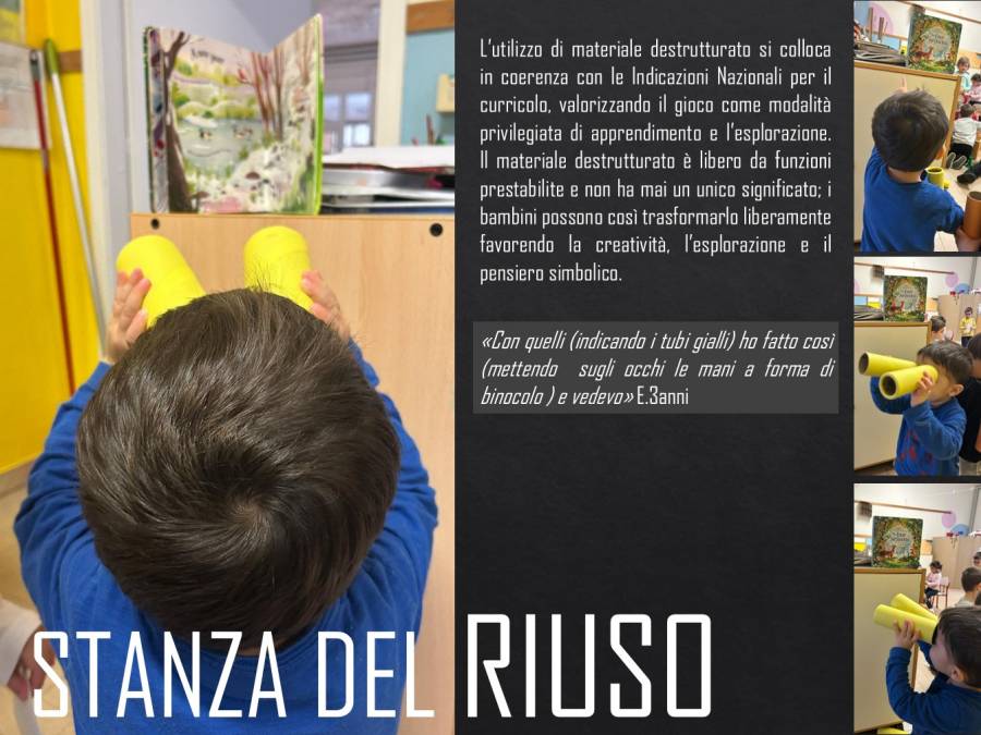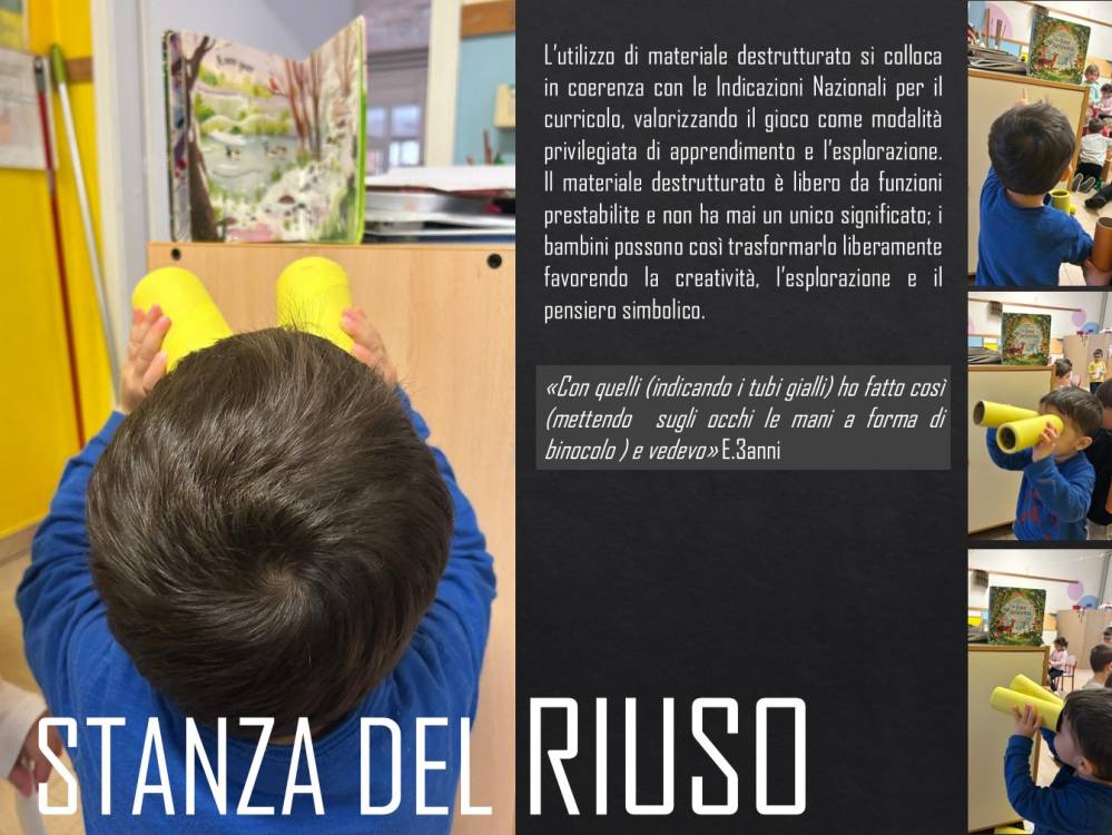 La stanza del RIUSO è uno spazio in cui si da nuova vita agli oggetti e che abitua i bambini ad avere sensibilità ecologica. Lo spazio ospita materiale destrutturato di ogni genere e forma -plastica, legno, stoffa-e i bambini possono esplorarlo ed utilizzarlo a piacimento. L'adulto non dirige l'uso del materiale e l'errore è parte del processo.