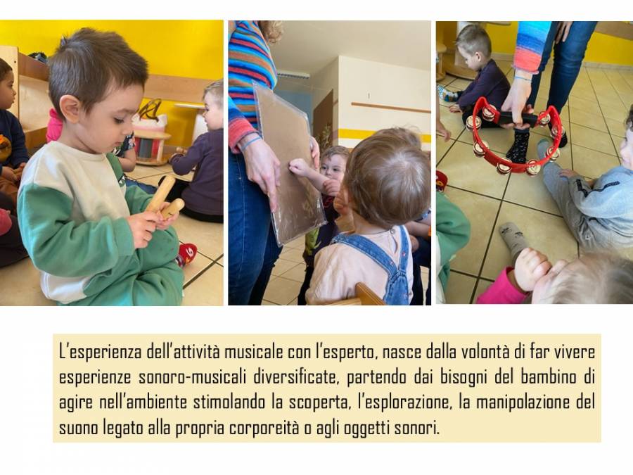 L’esperienza dell’attività musicale con l’esperto, nasce dalla volontà di far vivere esperienze sonoro-musicali diversificate, partendo dai bisogni del bambino di agire nell’ambiente stimolando la scoperta, l’esplorazione, la manipolazione del suono legato alla propria corporeità o agli oggetti sonori.