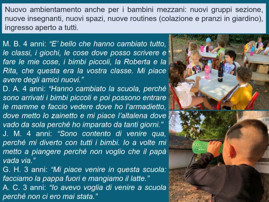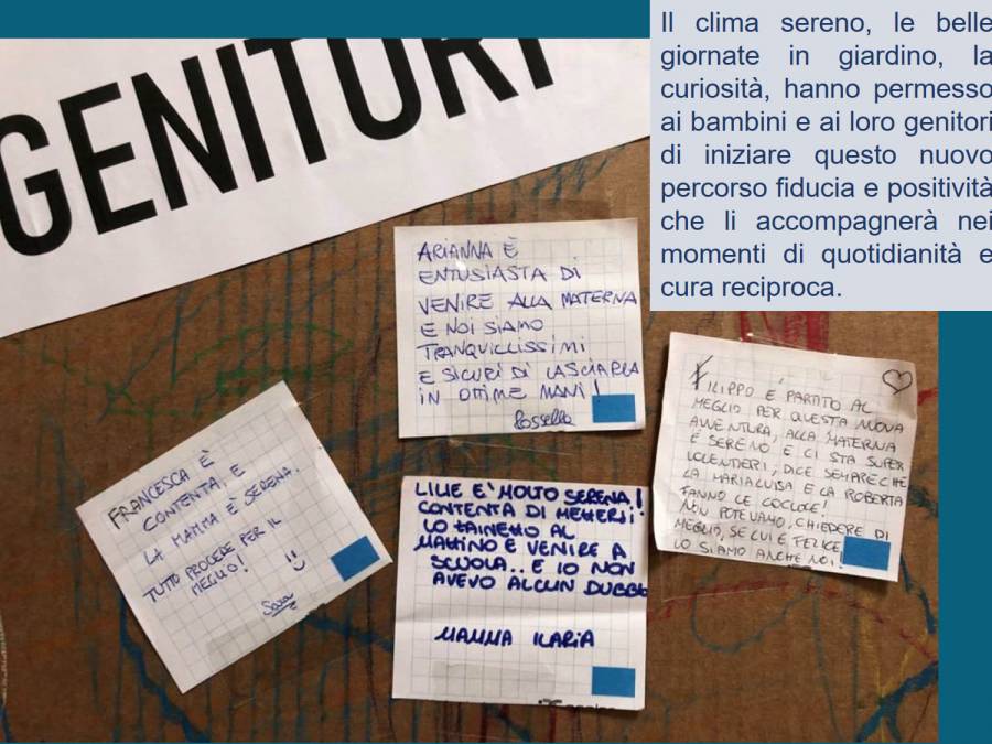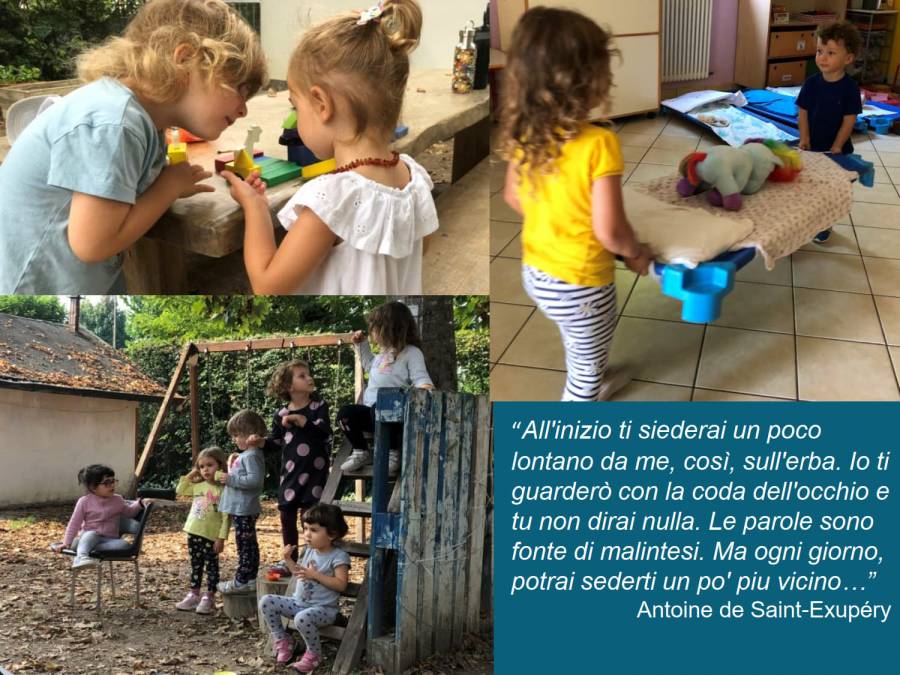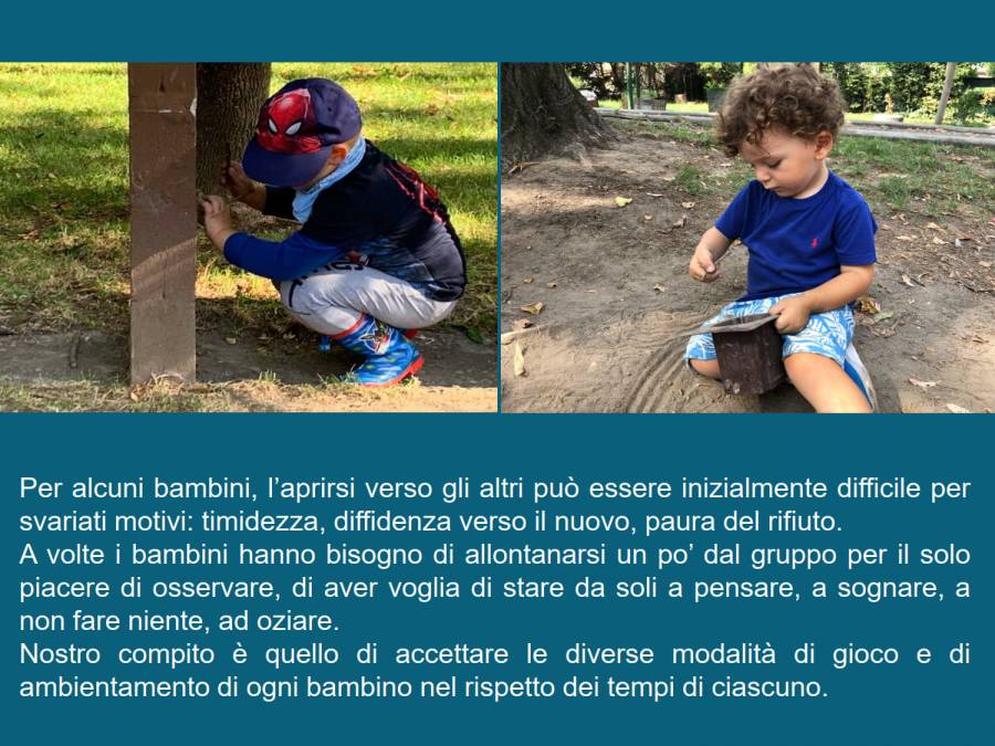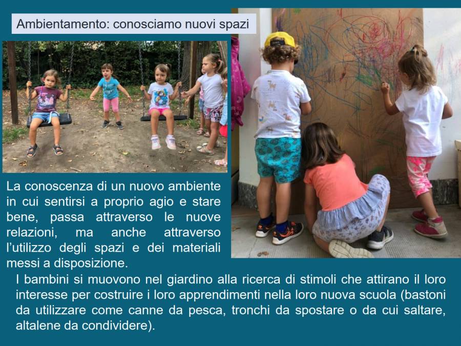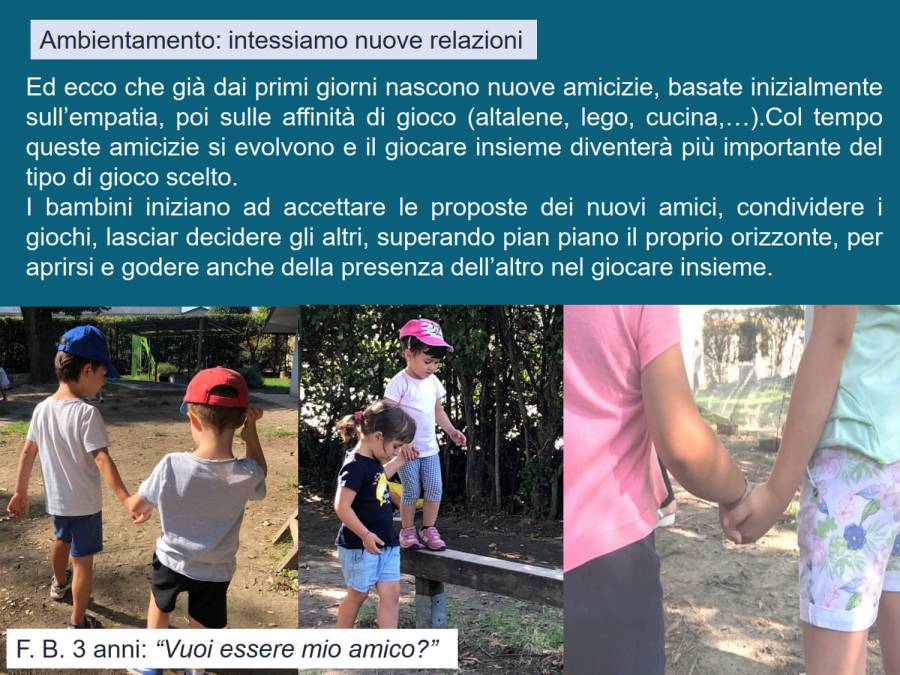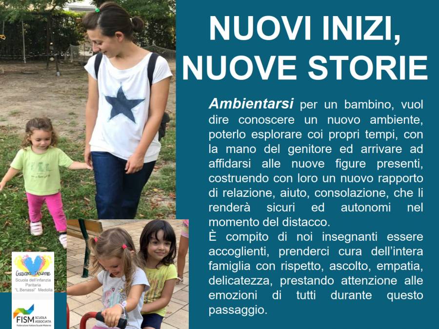 Ambientarsi per un bambino, vuol dire conoscere un nuovo ambiente, poterlo esplorare coi propri tempi, con la mano del genitore ed arrivare ad affidarsi alle nuove figure presenti, costruendo con loro un nuovo rapporto di relazione, aiuto, consolazione, che li renderà sicuri ed autonomi nel momento del distacco. È compito di noi insegnanti essere accoglienti, prenderci cura dell’intera famiglia con rispetto, ascolto, empatia, delicatezza, prestando attenzione alle emozioni di tutti durante questo passaggio.