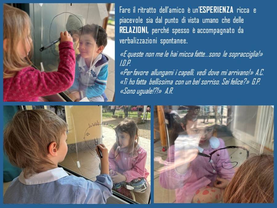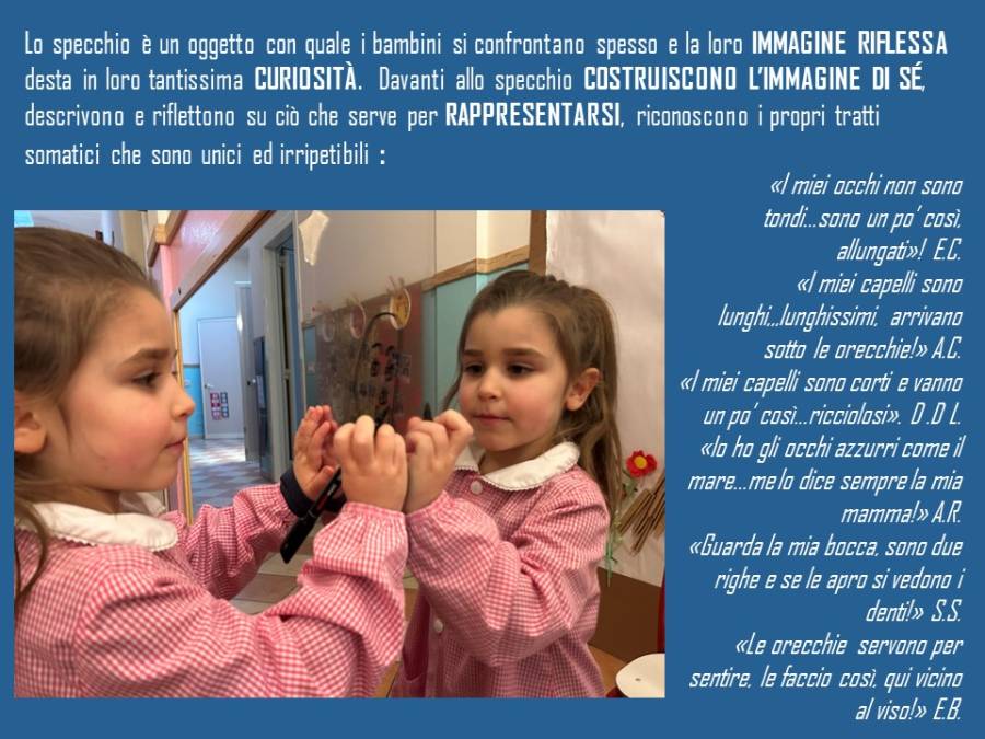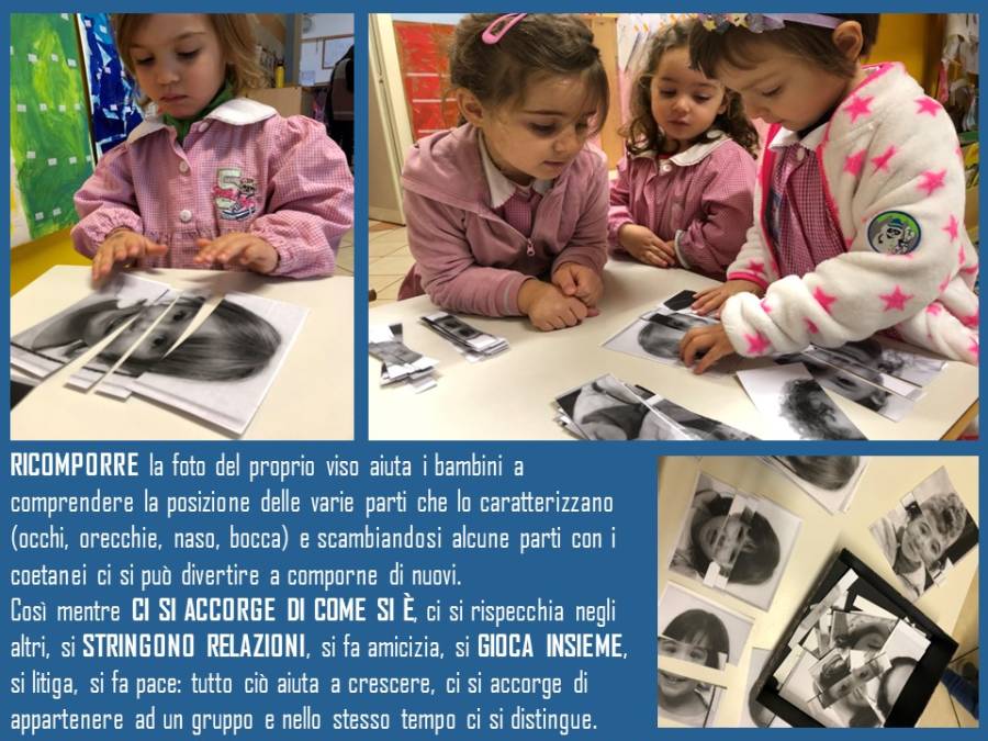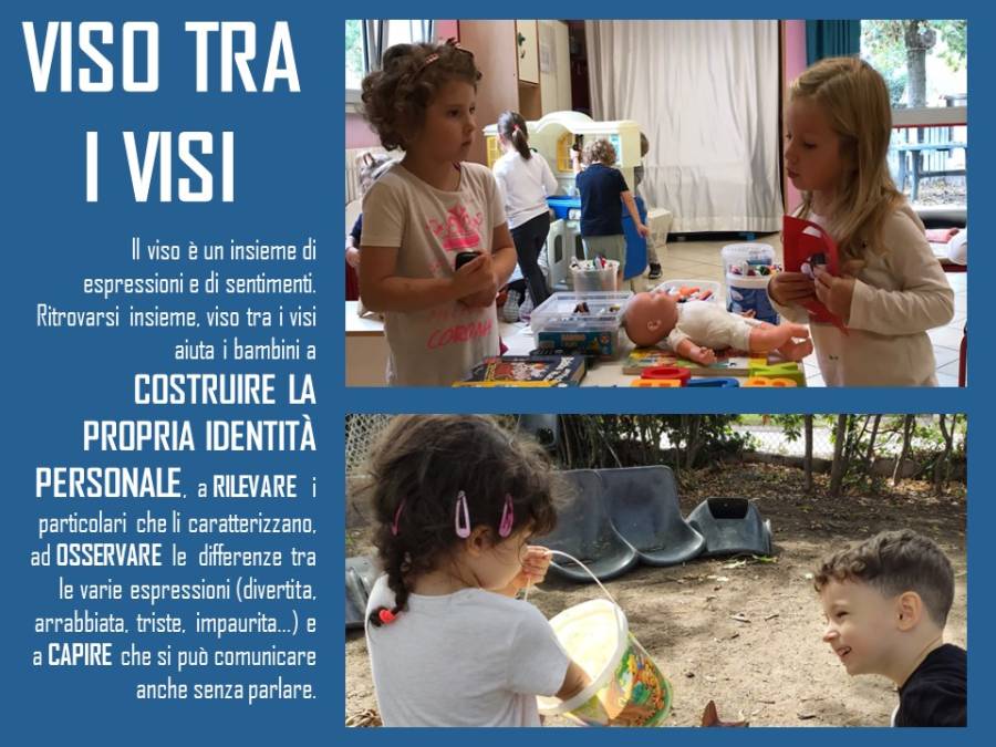 Ritrovarsi insieme, viso tra i visi aiuta i bambini a COSTRUIRE LA PROPRIA IDENTITÀ PERSONALE, a RILEVARE i particolari che li caratterizzano, ad OSSERVARE le differenze tra le varie espressioni (divertita, arrabbiata, triste, impaurita…) e a CAPIRE che si può comunicare anche senza parlare.