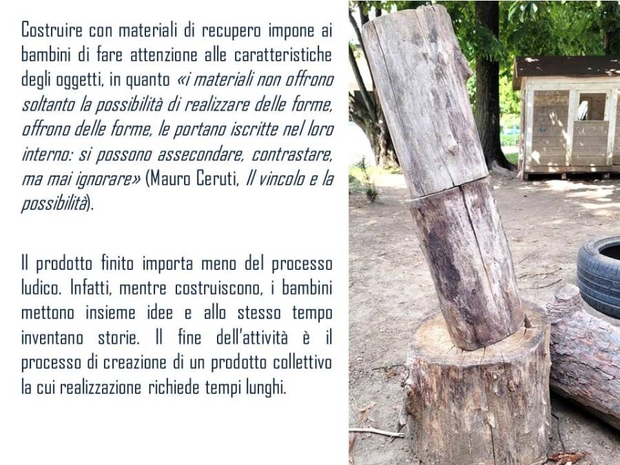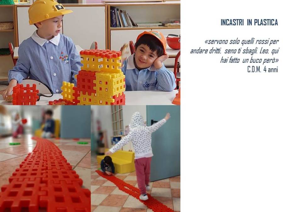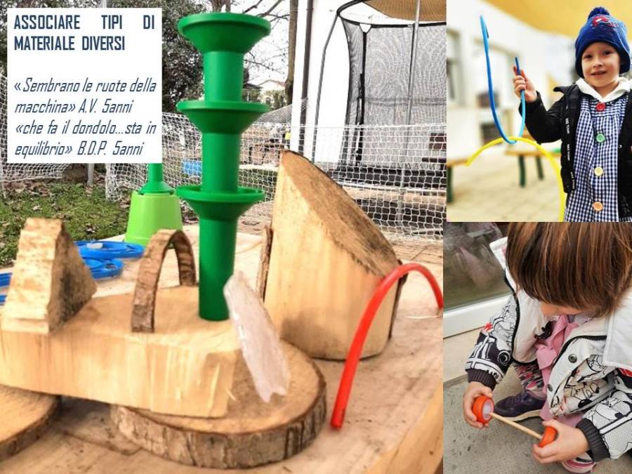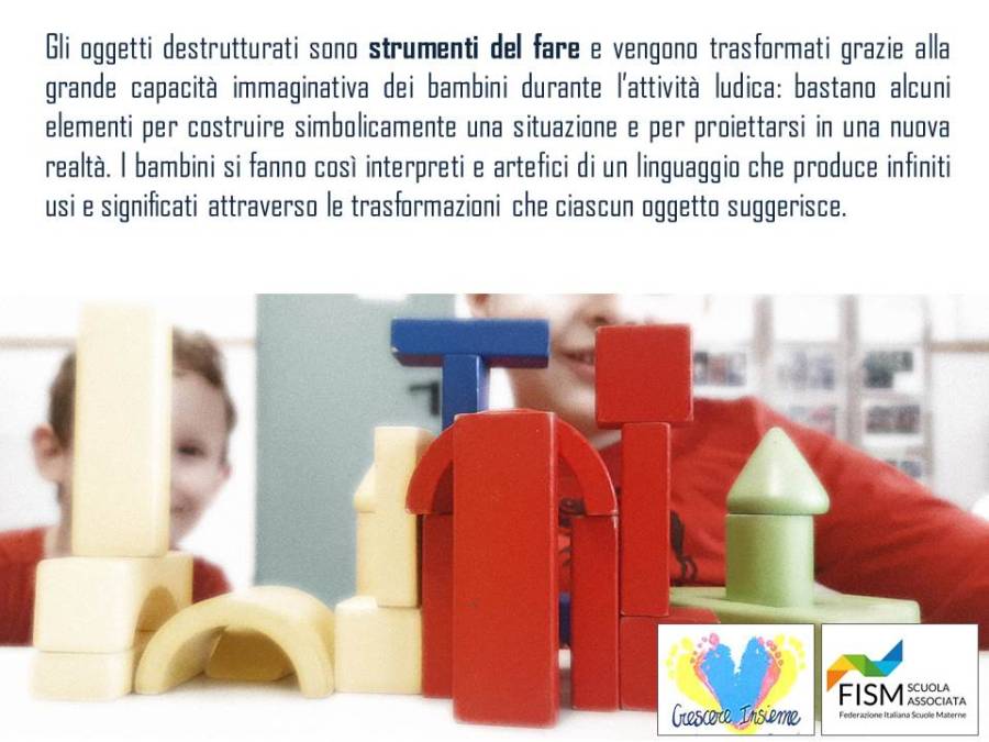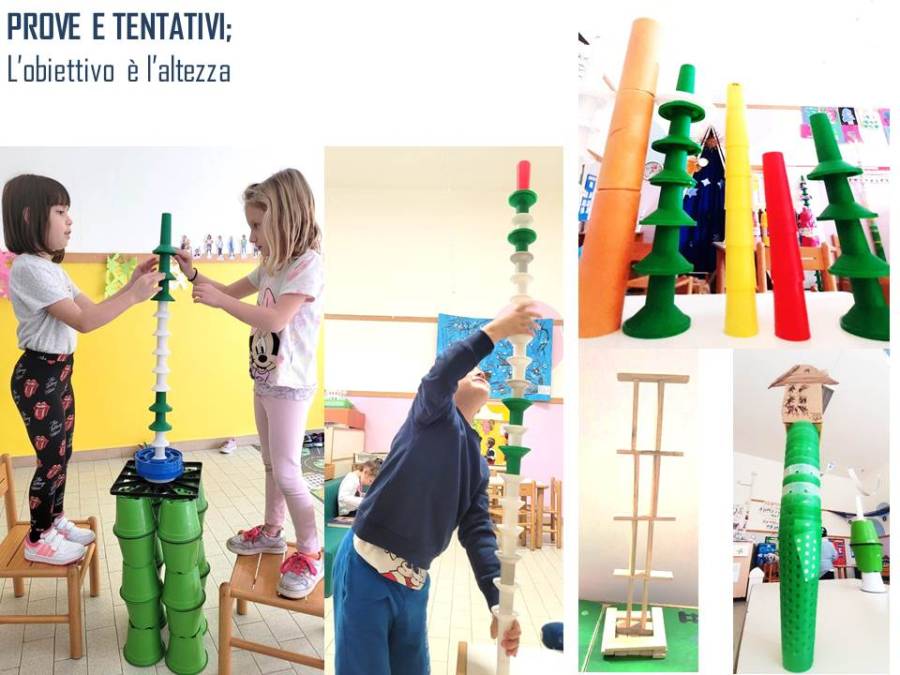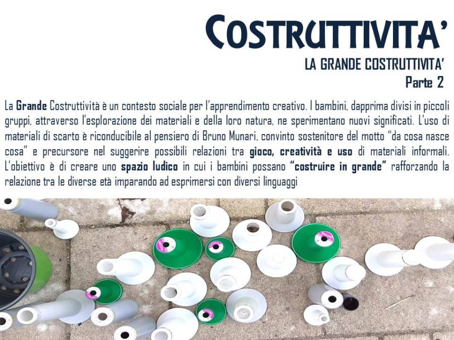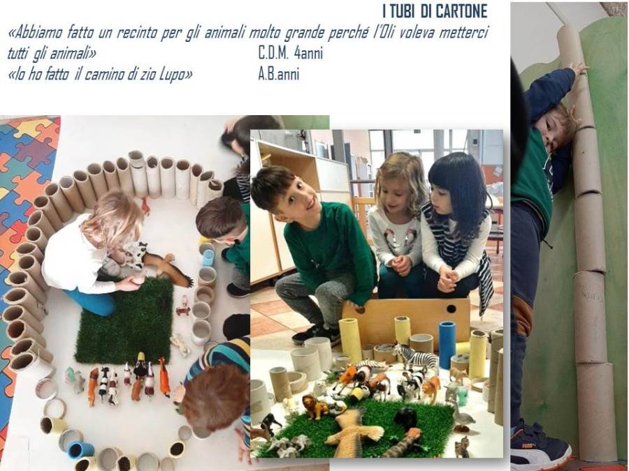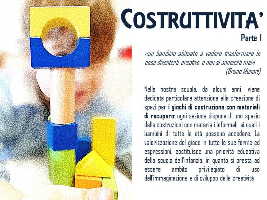 Nella nostra scuola, da alcuni anni, viene dedicata particolare attenzione alla creazione di spazi per i giochi di costruzione con materiali di recupero: ogni sezione dispone di uno spazio delle costruzioni con materiali informali, ai quali i bambini di tutte le età possono accedere. La valorizzazione del gioco in tutte le sue forme ed espressioni, costituisce una priorità educativa della scuola dell’infanzia, in quanto si presta ad essere ambito privilegiato di uso dell’immaginazione e di sviluppo della creatività