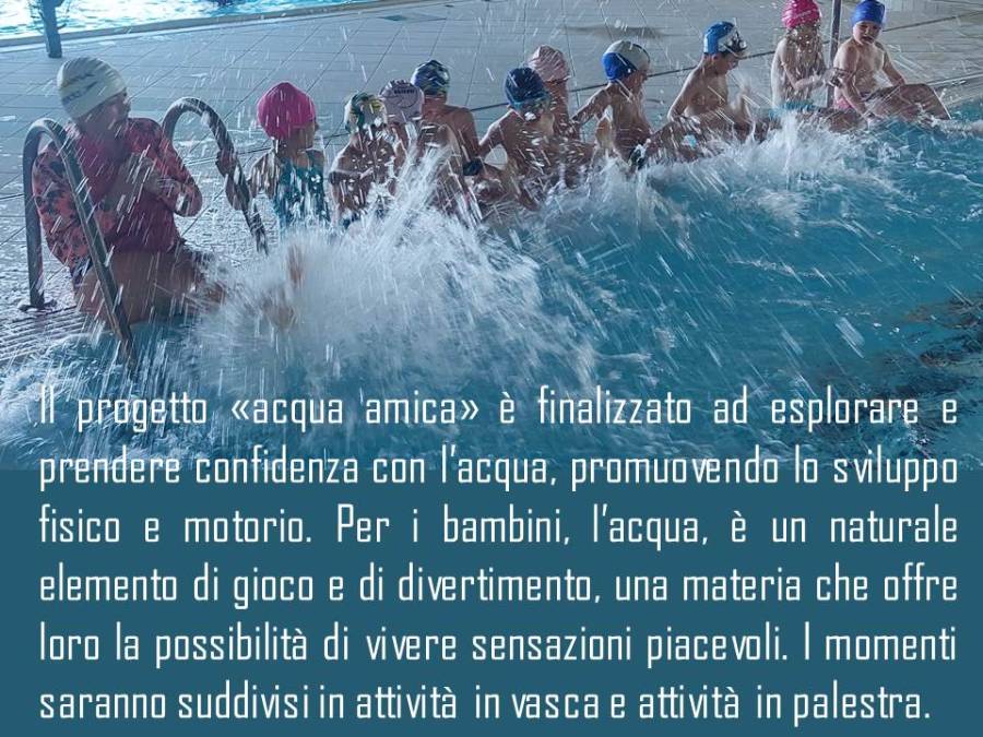 Oggi mercoledì 19 aprile si da il via al progetto «acqua amica», finalizzato ad esplorare e prendere confidenza con l’acqua, promuovendo lo sviluppo fisico e motorio. Per i bambini l’acqua è un naturale elemento di gioco e di divertimento, una materia che offre loro la possibilità di vivere sensazioni piacevoli. La mattinata sarà suddivisa in due momenti; uno di acquaticità in vasca e l'altro di psicomotricità in palestra