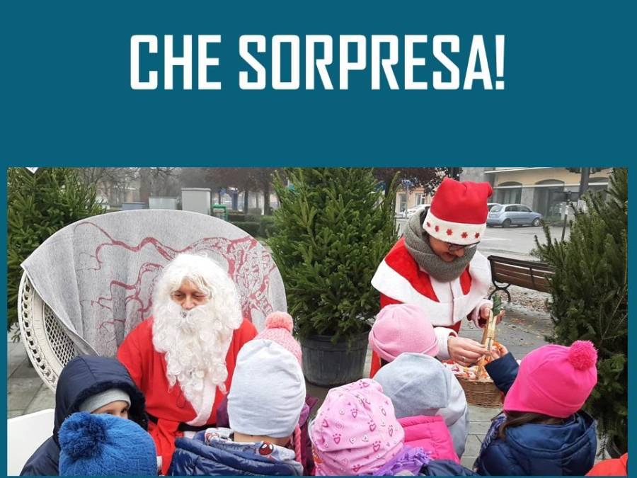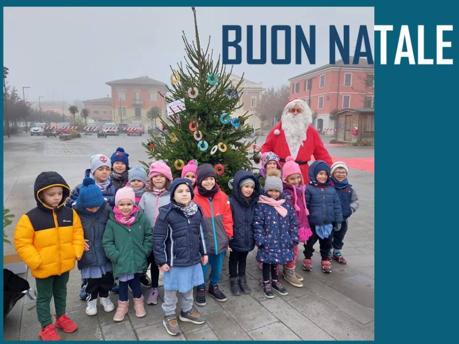 Come ogni anno la proloco di Medolla mette a disposizione ai vari ordini scolastici del paese, un abete da addobbare. Anche la nostra scuola aderisce all'iniziativa. Ben coperti e con i nostri addobbi pronti, ci rechiamo in piazza, avvolta dalla nebbia, per arricchiere di "luce" l'abete...ma non finisce qui! Babbo Natale e il suo aiutante ci raggiungono e per ringraziarci, ci offrono dolciumi e mandarini. Bambini sorpresi e felici!