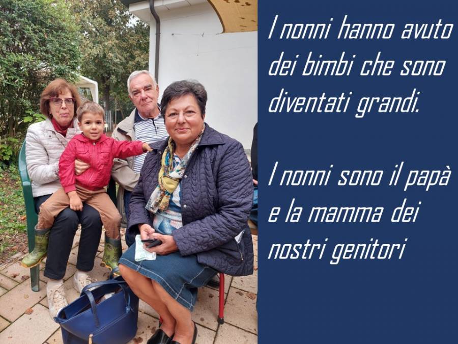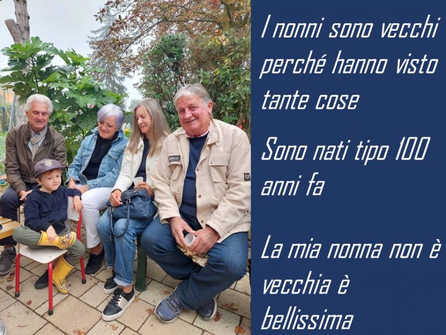 Da alcuni anni il 2ottobre si festeggiano anche i nonni, che sono i nostri angeli custodi in terra. Da sempre tanti nonni partecipano alla vita della nostra scuola: conversazioni e letture fanno apprezzare ancora di più ai bambini l’importanza di queste figure tanto vicine a loro con cui instaurano un rapporto di affetto e fiducia. I nonni sono una fonte inesauribile di storie e di esperienze di vita vissuta che accompagnano i nipoti nel loro percorso di crescita, arricchendolo di infinite sfumature.