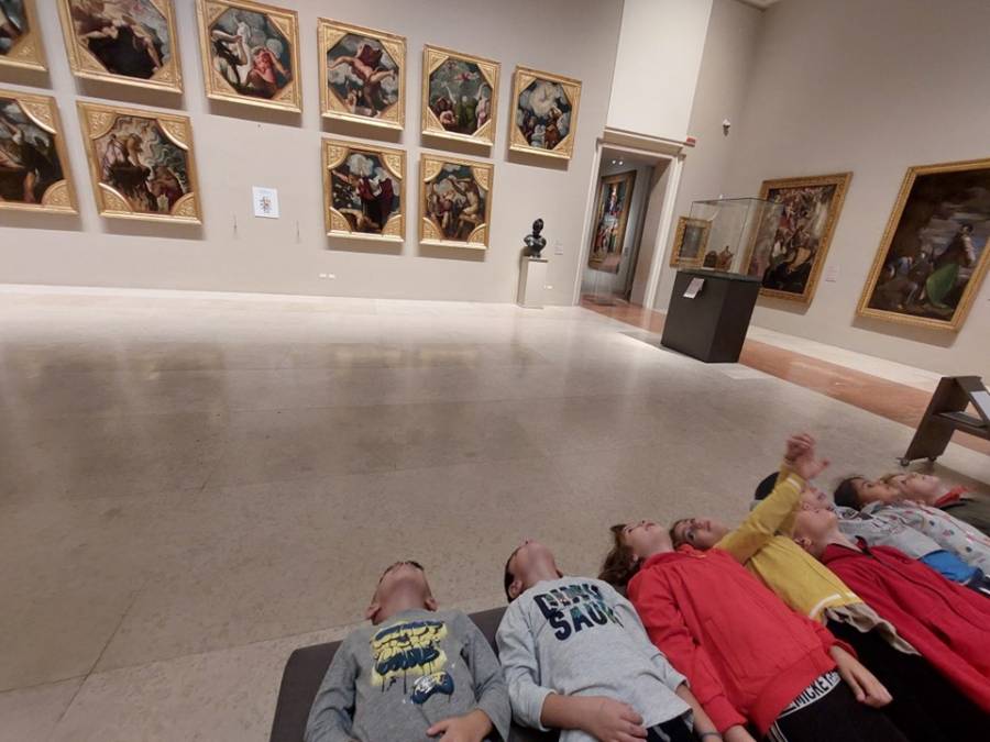 Al museo abbiamo visto tutto, c’era un disegno su una tela tutta stropicciata; il violino che non suona mica perché è bucato ma bellissimo e arrivano da lontano per vederlo; una signora che dorme e sogna; tutte le persone storte ma noi ci siamo messi alla rovescia e li abbiamo visti...e poi un pezzo di muro che è un disastro, senza cornice, gli manca il disegno ed è colore grigio. (Dalla conversazione in grande gruppo)