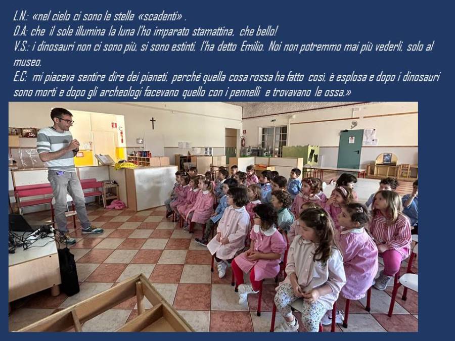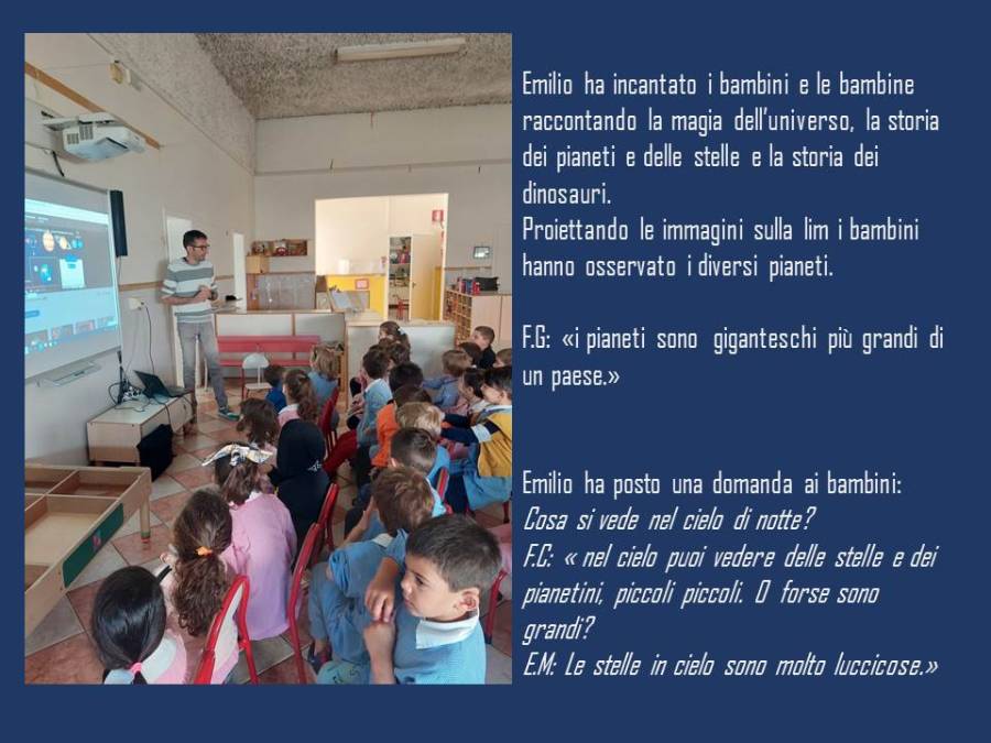 « indovina chi viene a scuola» oggi le bambine e i bambini hanno conosciuto Emilio, papà di Diletta che ha raccontato la storia dell’universo. L'universo è comunemente definito come il complesso che racchiude tutto lo spazio e ciò che contiene, cioè la materia e l'energia, i pianeti, le stelle, le galassie e il contenuto dello spazio intergalattico.