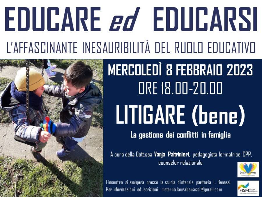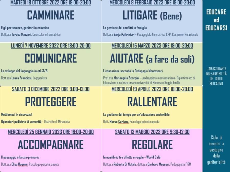 - 9 marzo 2023 dalle 18:00 alle 19:30 a cura di Maria Elisa santini, pedagogista coordinatrice formativa del Centro di Consulenza per la famiglia dell'Arcidiocesi di Modena-Nonantola(on line)